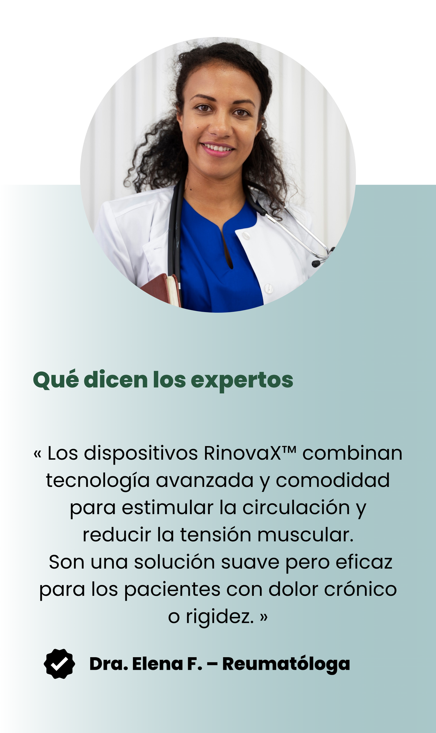 RinovaX™ relaja profundamente los músculos, reduce la tensión y favorece una mejor circulación, sin medicamentos ni fisioterapia.